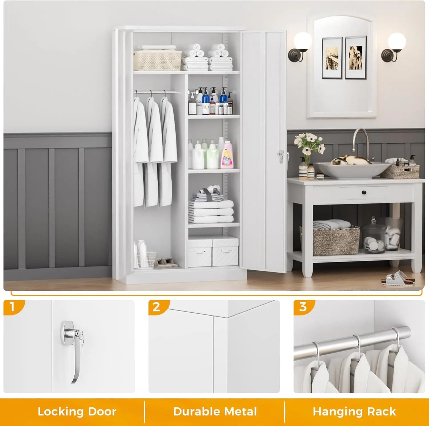 72” Tall Wardrobe Closet with Lock,Clothing Storage Cabinets with Hanging Rod and 4 Adjustable Shelves, Armoire Wardrobe