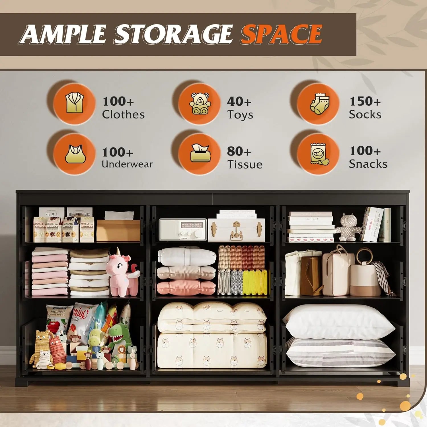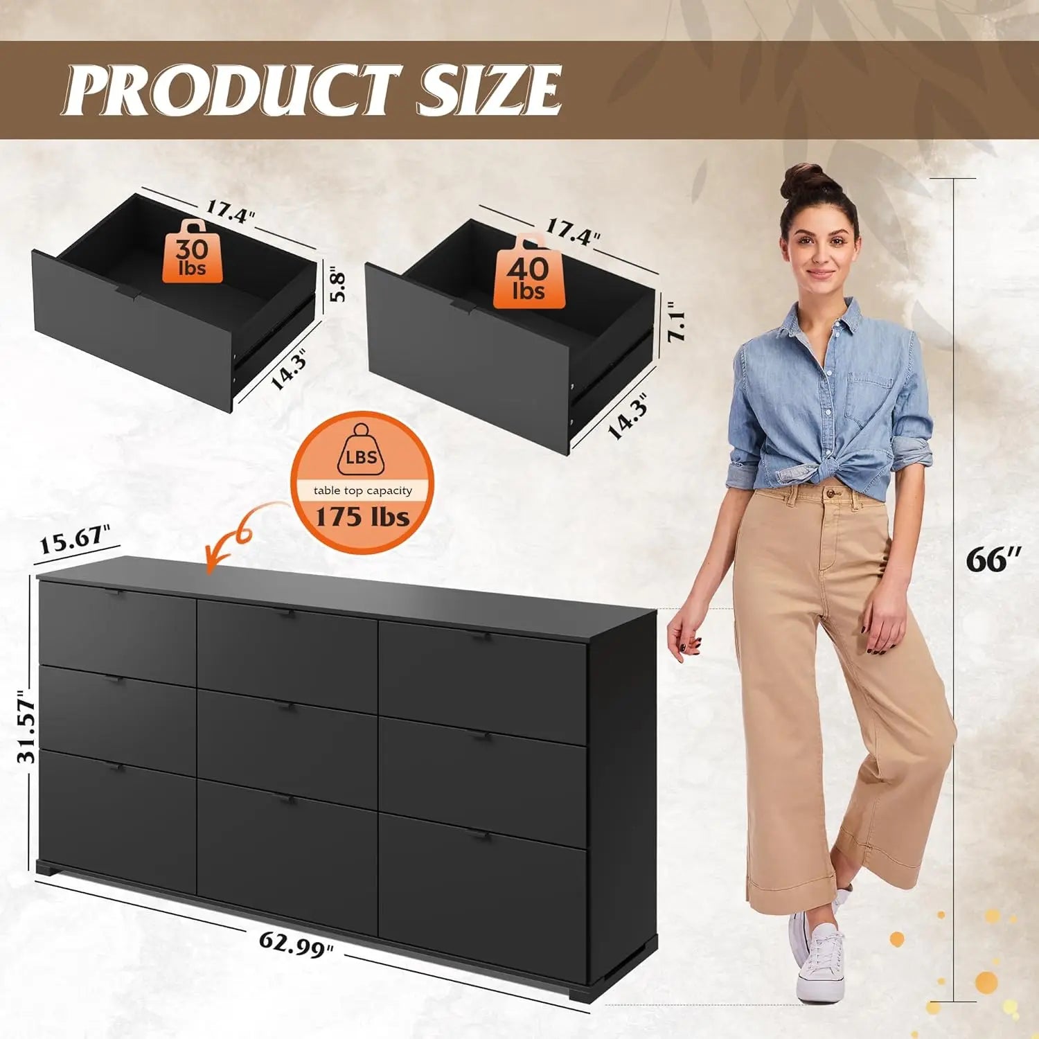 9 Drawer Dressers, Modern Large Wood Dresser Chest for Bedroom Organize with Sturdy Metal Handle, Black (63" W)
