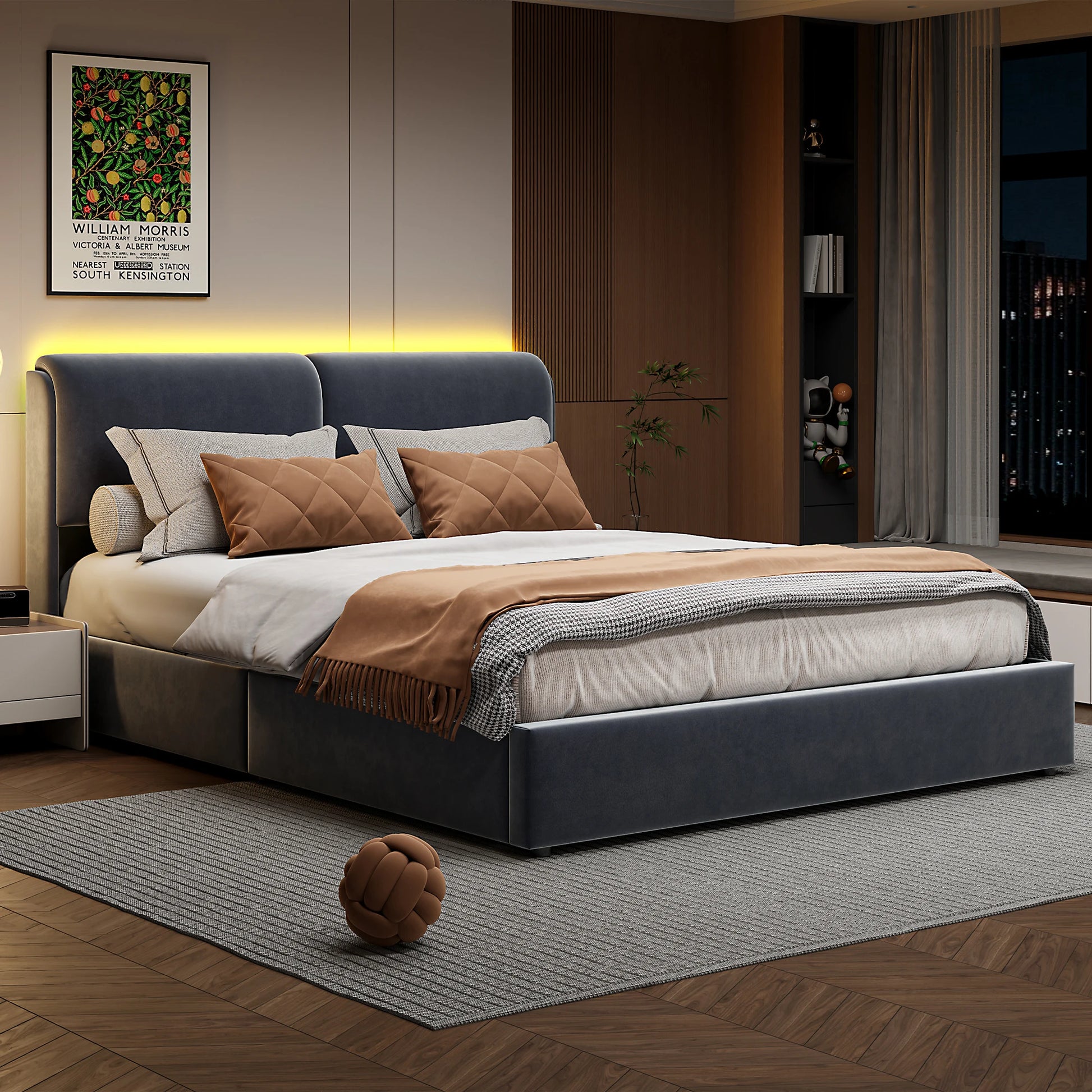Anajqaqia 160×200 cm Upholstered Double Bed, Hydraulic Bed with LED Light and Slatted Base,Under-bed Storage Space, Velvet, Grey