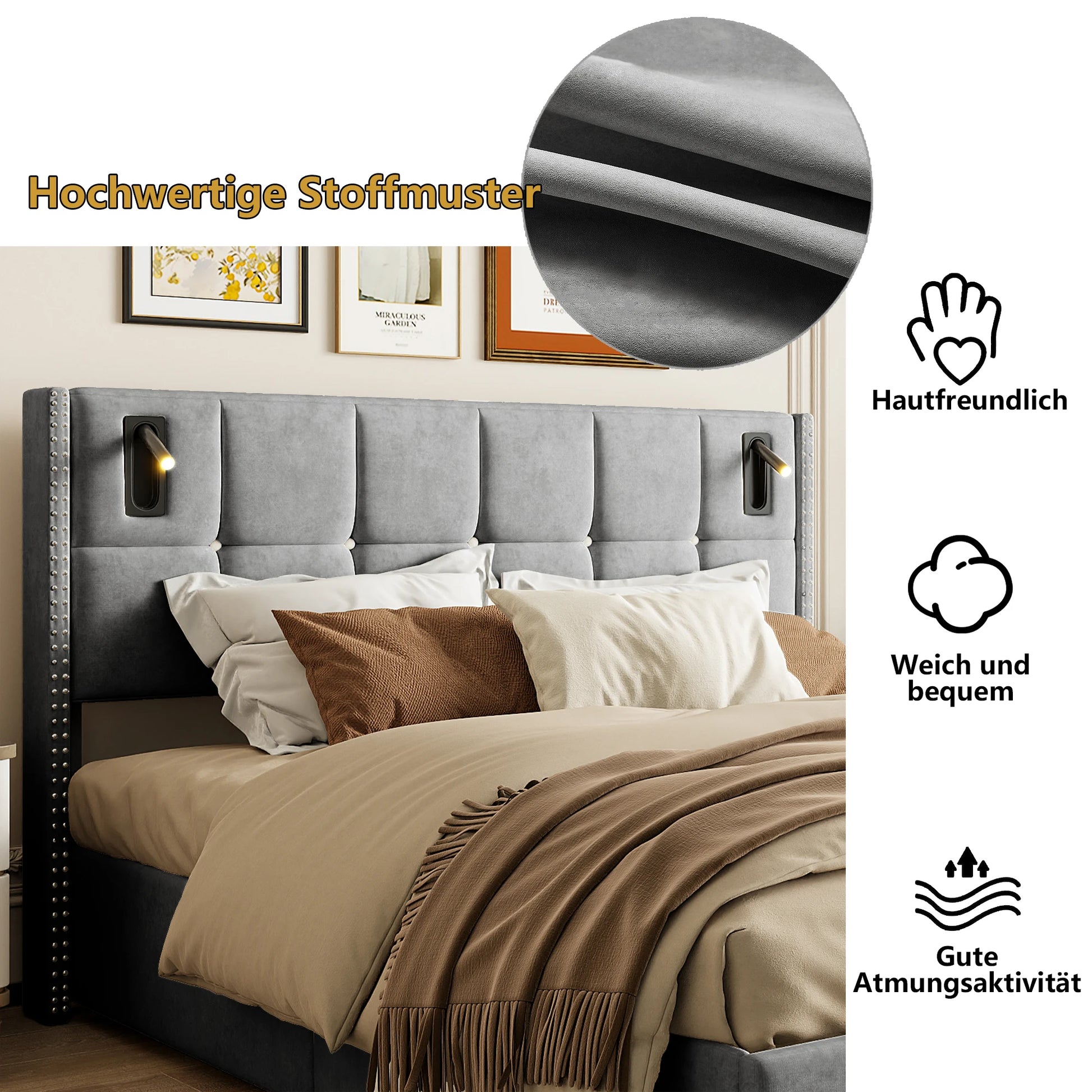 Double Bed 160x200cm, Upholstered Bed with USB & Reading Lamps, Bed Box, Storage Beds Bed Frame Velvet, Youth Bed with Headboard