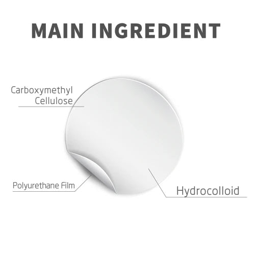 Composition: Hydrocolloid, carboxymethyl cellulose, polyurethane film