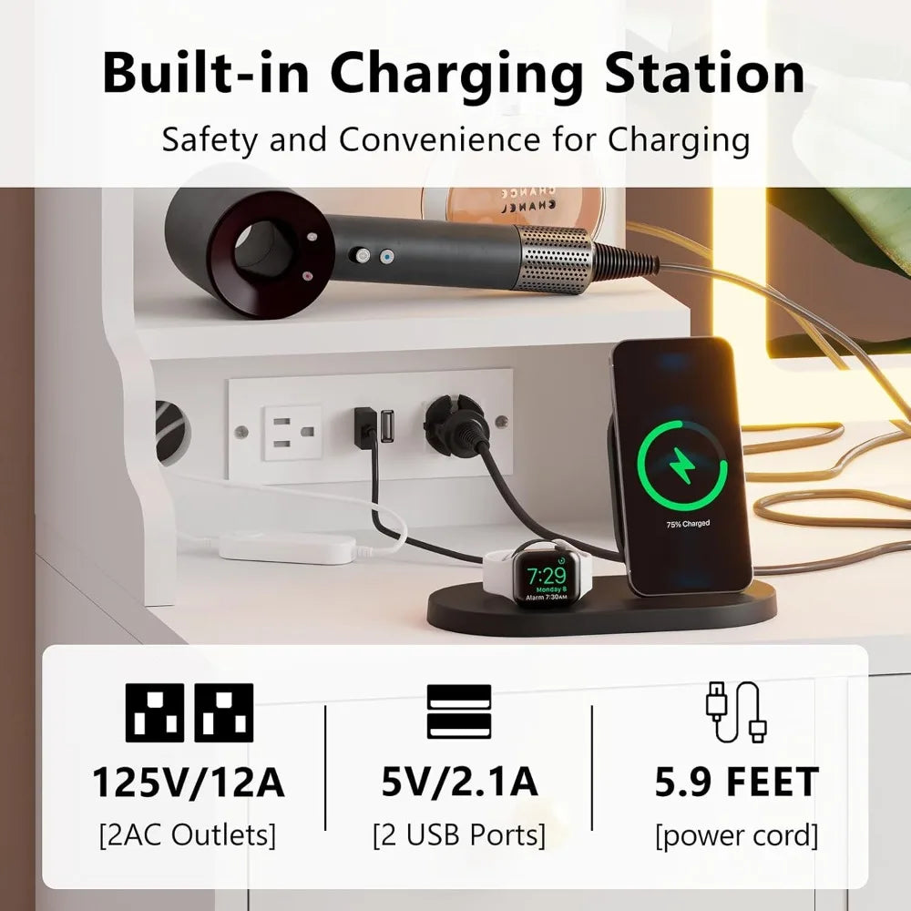 White Makeup Vanity Desk with Mirror and Lights, Large Vanity Table Set with Charging Station, Dressing Table with RGB Cabinets,